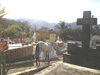 Quando saíamos do cemitério e tocávamos para fora um dos cavalos, que ali pastavam e faziam suas necessidades, perguntei ao Henriquinho sobre a sepultura do Sr. Celso Descio, ele disse-me: eu sei onde está. E mostrou-me uma catacumba bem feita e sem nomes, com um anjo daqueles de mármore, que tinha na tumba do coronel Descio, no cemitério velho.